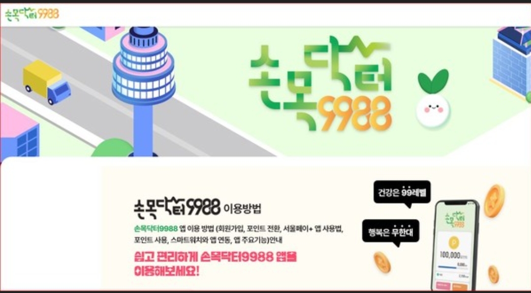 ‘손목닥터9988’은 서울 시민 모두가 99세가지 88(팔팔)하게 건강한 삶을 누릴 수 있도록 지원하는 서울시의 헬스케어 프로그램입니다. 이 프로그램은 스마트워치와 전용 앱을 통해 시민들의 건강 활동을 체계적으로 관리하며, 전반적인 신체 건강을 개선하는 것을 목표로 하고 있습니다.